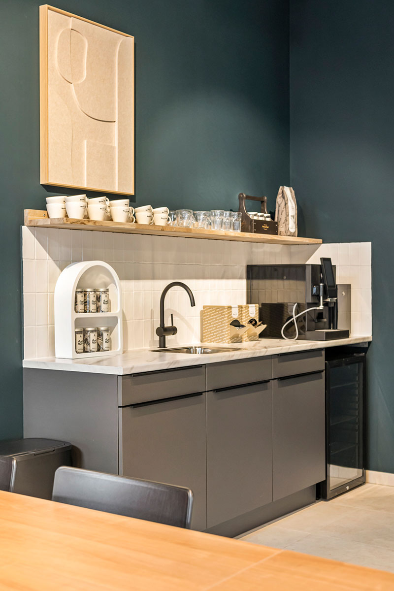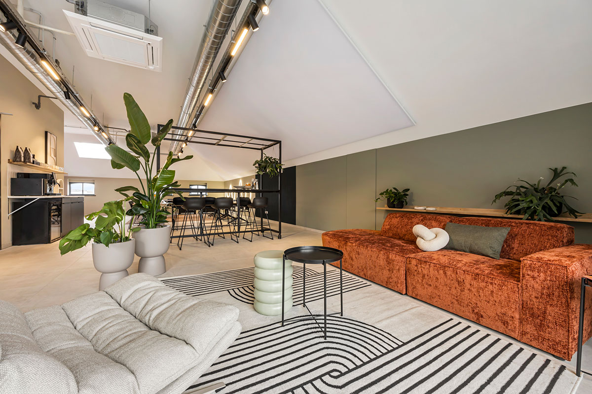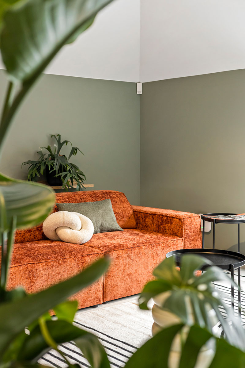 Gezellige loungehoek met een oranje fluwelen bank en een strak vormgegeven vergadertafel, ideaal voor een informele en productieve setting.